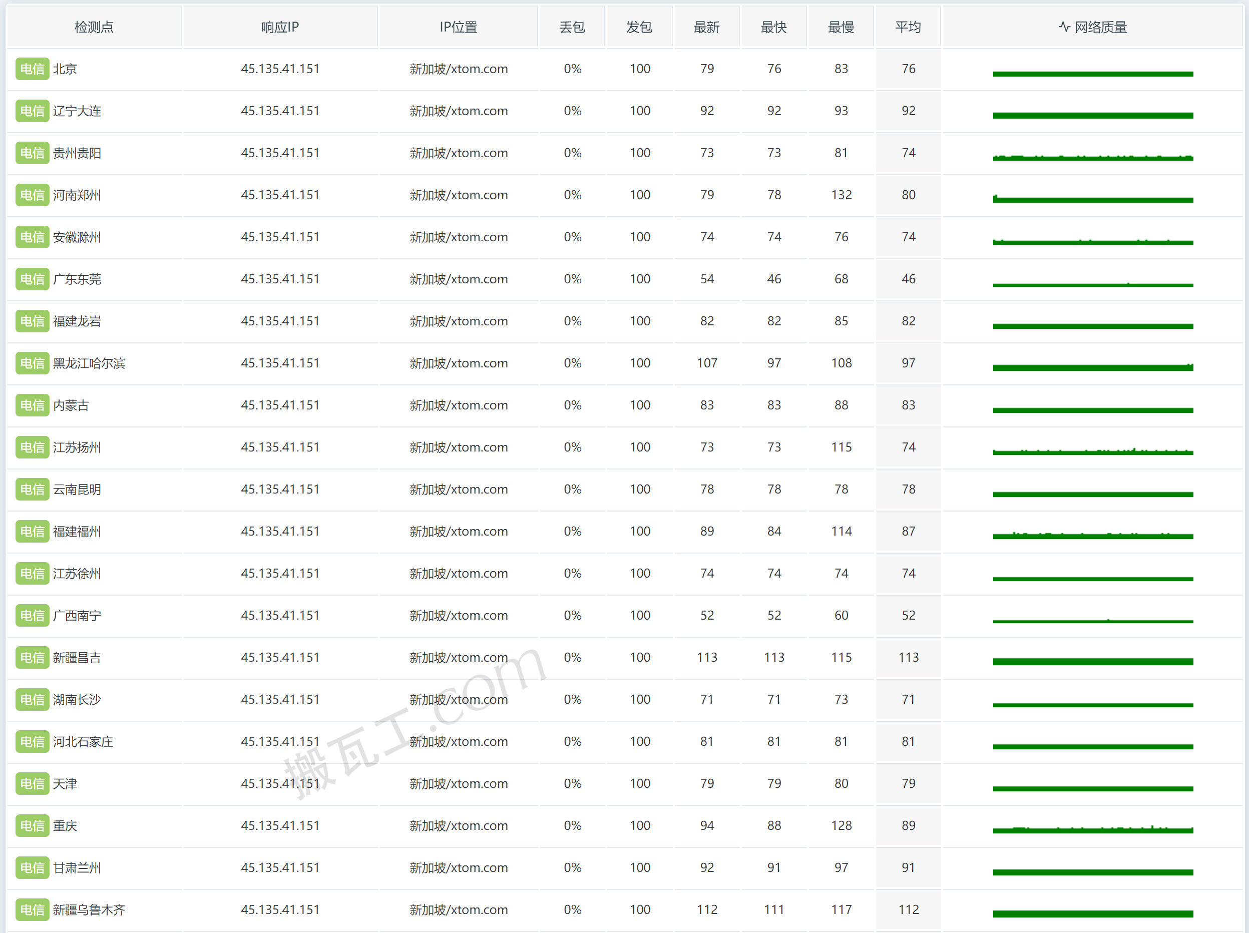 搬瓦工新加坡CN2 GIA套餐(SG - Singapore CN2GIA (SG_1))直连中国大陆延迟表现测试结果: