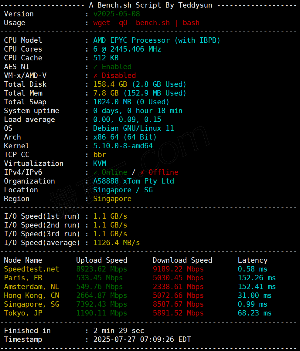 搬瓦工新加坡CN2 GIA套餐(SG - Singapore CN2GIA (SG_1))性能表现测试结果: