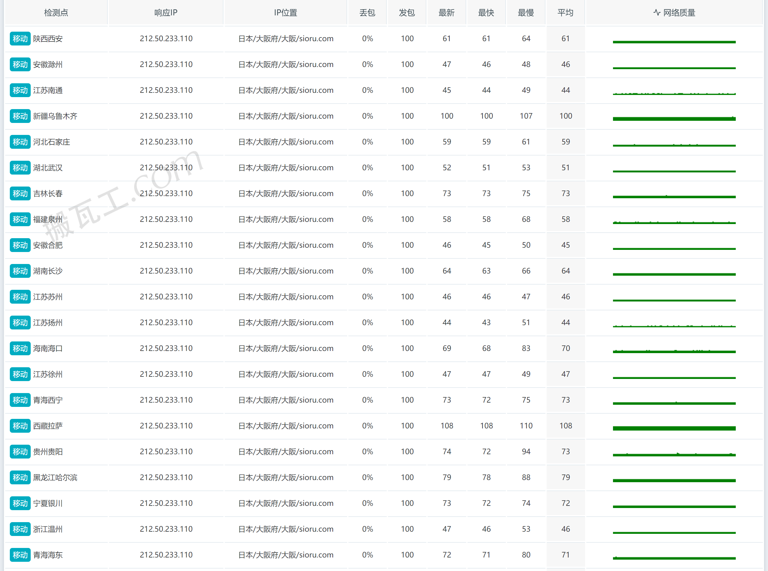 搬瓦工日本大阪CN2 GIA套餐(JP - Osaka Equinix CN2GIA (JPOS_6))移动丢包响应表现测试结果: