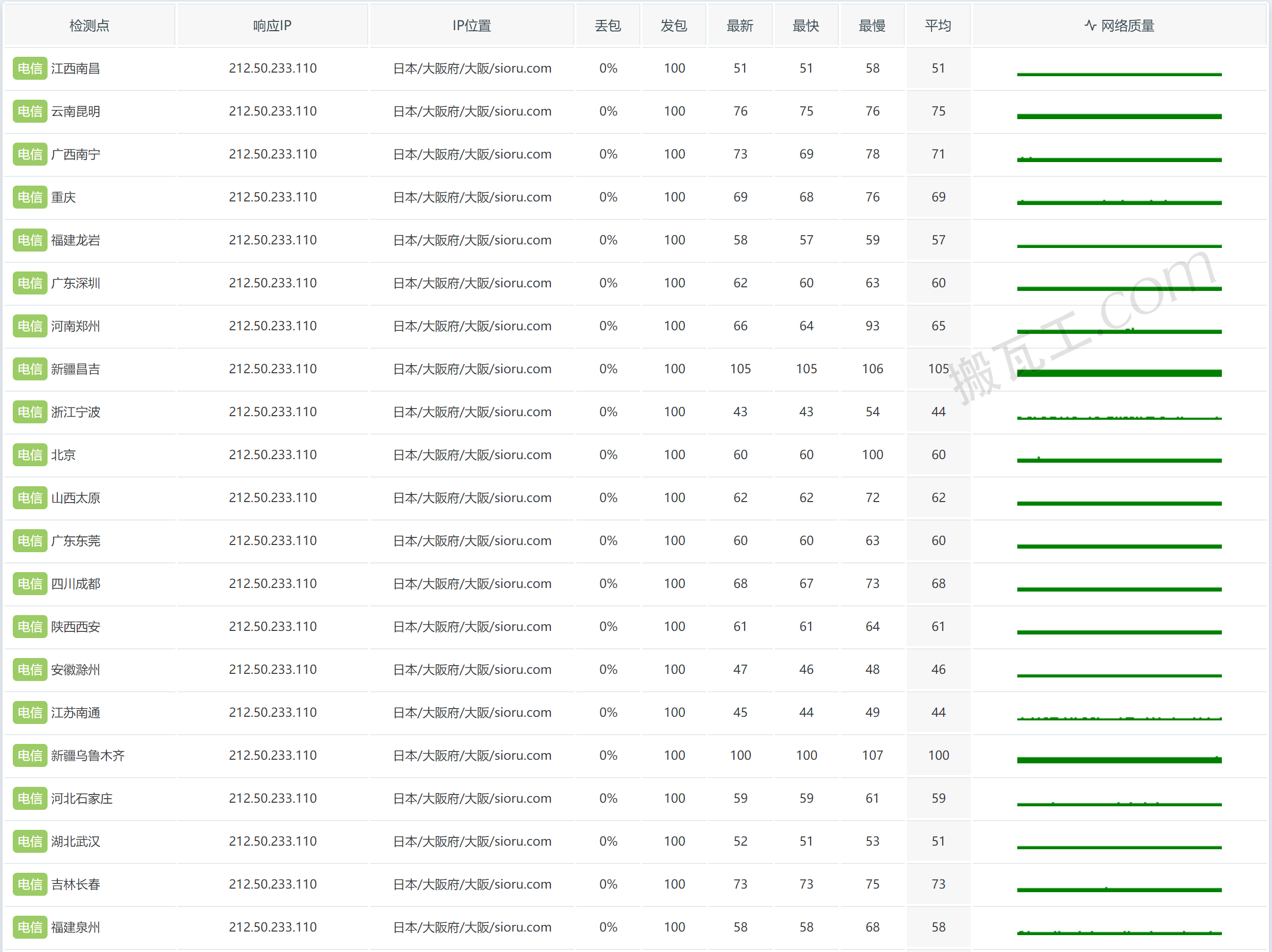 搬瓦工日本大阪CN2 GIA套餐(JP - Osaka Equinix CN2GIA (JPOS_6))电信丢包响应表现测试结果: