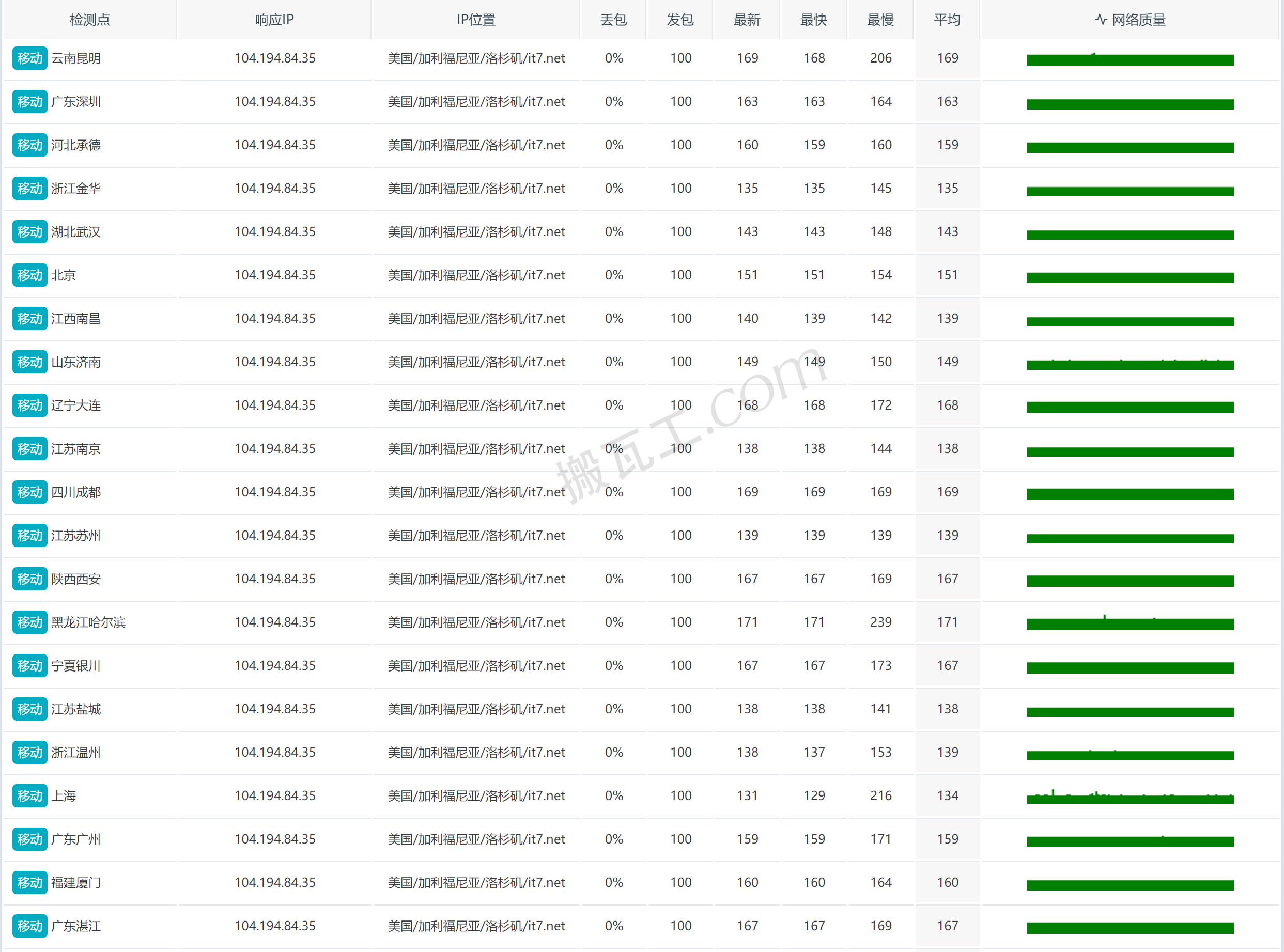搬瓦工美国洛杉矶DC9 CN2 GIA套餐(US - Los Angeles DC9 CN2GIA (USCA_9))中国移动丢包表现测试结果:abcd
