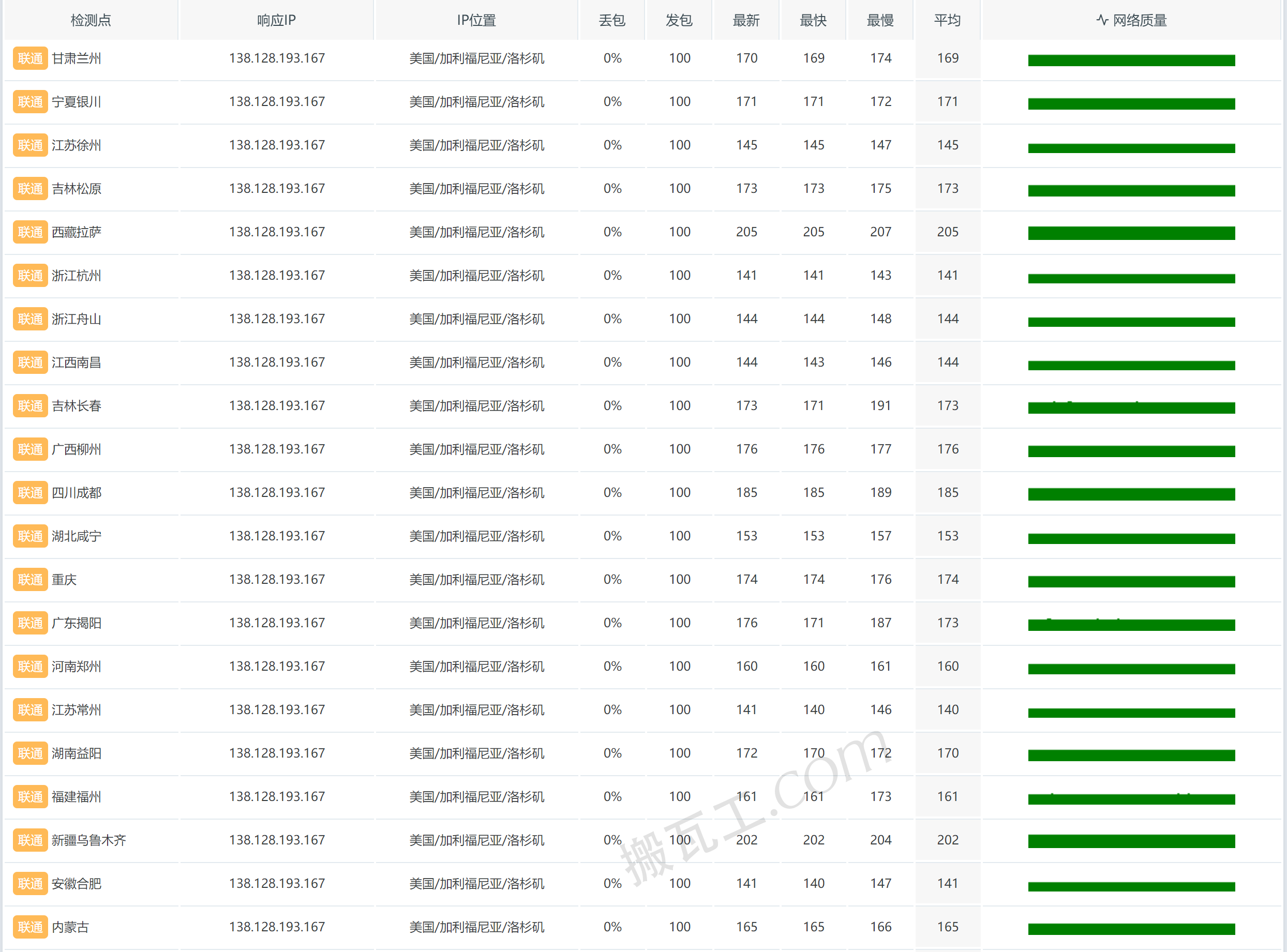 搬瓦工美国圣何塞机房CN2 GIA套餐(US - San Jose (USCA_SJC5))直连中国大陆延迟表现测试结果: