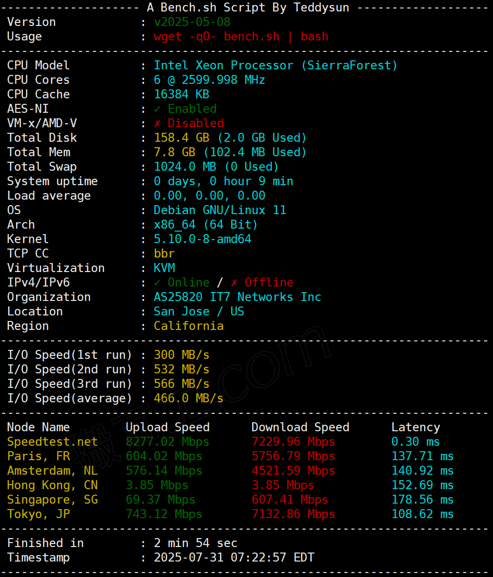 搬瓦工美国圣何塞机房CN2 GIA套餐(US - San Jose (USCA_SJC5))性能表现测试结果: